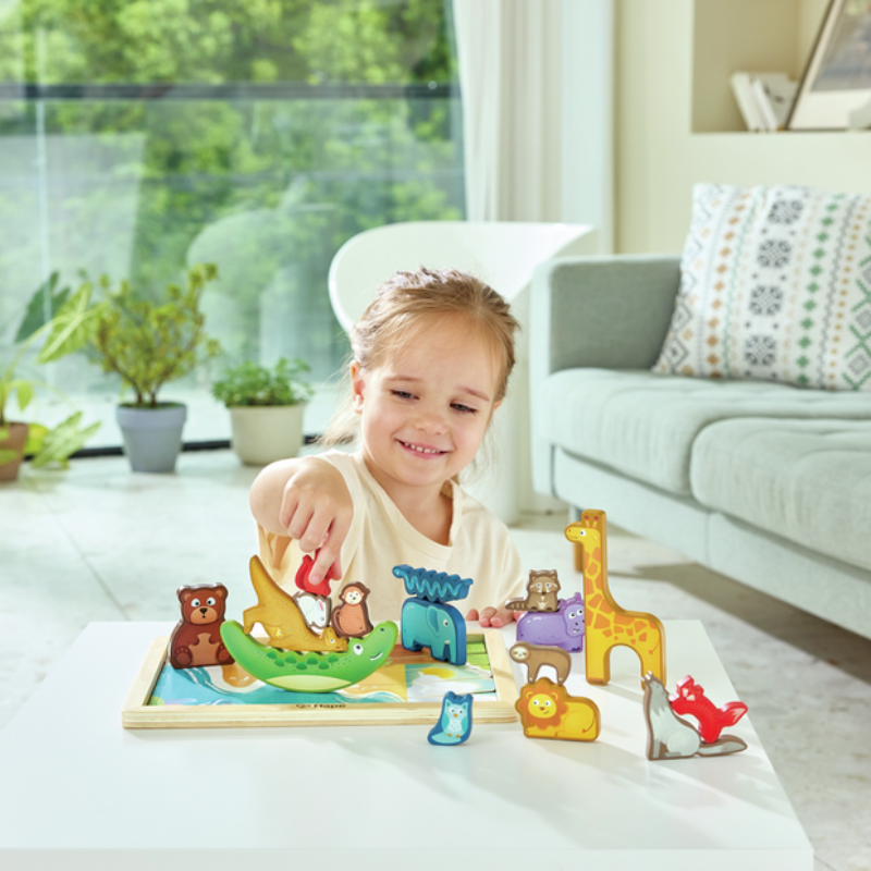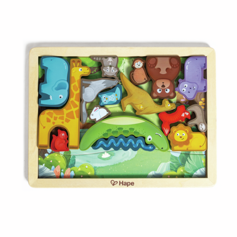 Este rompecabezas de bloques de madera presenta 16 animales populares, cada uno lo suficientemente grueso para que las pequeñas manos puedan apilarlos, clasificarlos y colocarlos en un lugar, lo que mejora tanto las habilidades cognitivas como la motricidad fina. Viene con cinco tarjetas que representan varios entornos naturales para enriquecer la narración y el juego de roles. Cada animal encaja perfectamente dentro del marco del rompecabezas para un almacenamiento organizado y un mayor aprendizaje espacial. Este juego anima a los niños a aprender los nombres, las características y los hábitats de los animales a través del juego imaginativo.