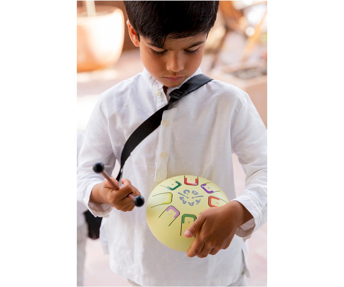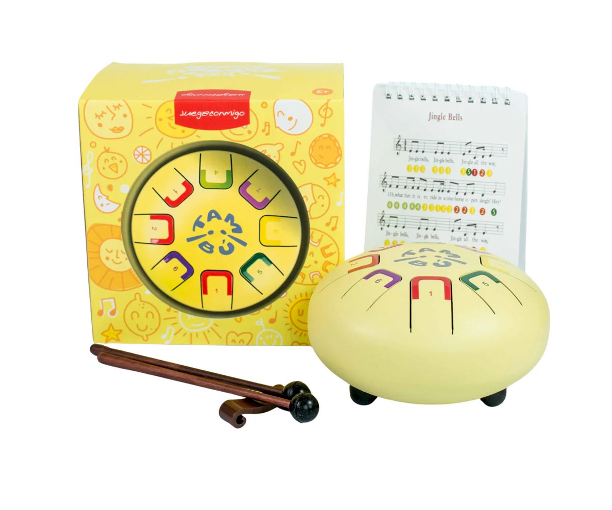 Especialmente diseñado para niños es compacto y tiene 8 notas diferenciadas por números y colores que emiten sonidos armónicos relajantes que se pueden tocar con baquetas, con las púas de dedos o con las manos y de cada manera se producirá una intensidad de sonido distinta.
