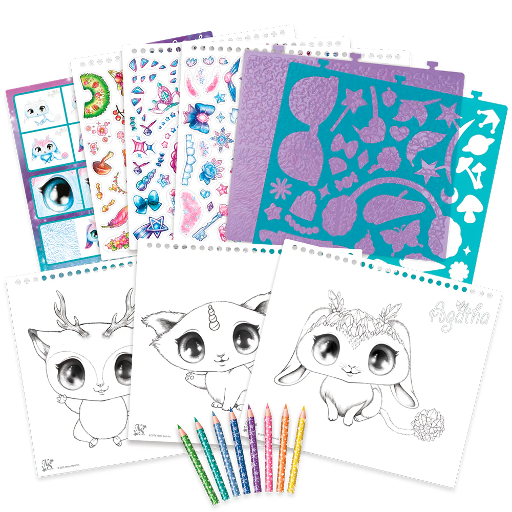 Este cuaderno de bocetos será el favorito de todas las niñas. 30 páginas de animales adorables y mágicos para colorear, con plantillas, patrones para frotar y pegatinas.
