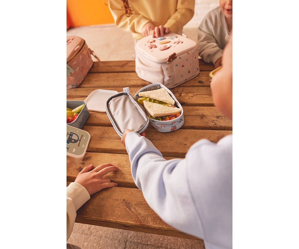 Pequeña bolsa almuerzo muy cómoda para llevar al colegio un bocadillo y una pieza de fruta. Su tamaño tan compacto hace que no ocupe mucho y su interior térmico permite que se mantenga la temperatura más tiempo.